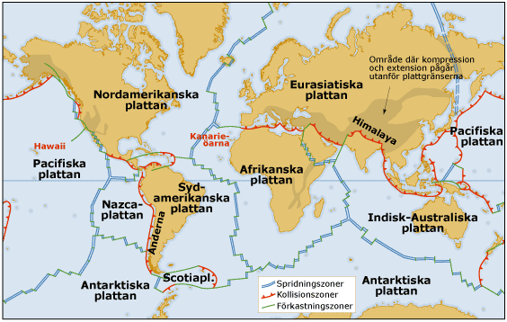 Från SGU:s hemsida. De flesta jordbävningar och vulkanutbrott inträffar där litosfärplattorna rör sig i förhållande till varandra. I Sverige, som ligger långt in på den eurasiatiska plattan, förekommer visserligen jordbävningar – men mycket svaga sådana. Däremot är kraftiga jordbävningar vanliga i områden där plattorna kolliderar (kollisionszoner). Några sådana exempel är Nord- och Sydamerikas västkust, Himalaya, Turkiet och Japan.