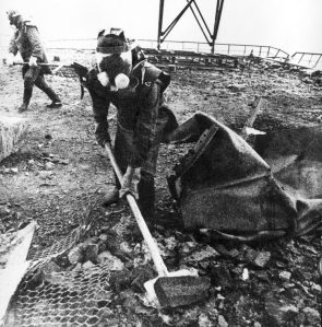 Då återstod det bara en lösning, nämligen människor, och främst då anställa på kärnkraftsverket och andra anställda inom kärnkraftsindustrin, soldater, brandmän, gruvarbetare och en del frivilliga. Summa summarum deltog 600 000 personer i arbetet.