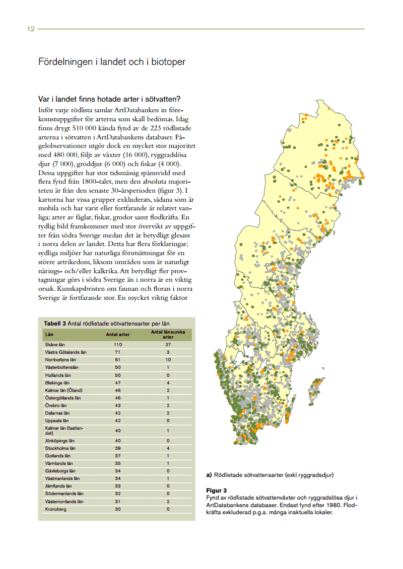 Sverige är rikt på sötvattensmiljöer och limniska biotoper hyser fler än 5 000 arter av flercelliga organismer. För ca 1 800 av dessa arter är kunskapen så god att rödlistebedömningar kan göras. I 2010 års svenska rödlista återfinns 223 sötvattensarter. Gruppen domineras av ryggradslösa djur med 133 arter. Resterande arter utgörs av alger, kärlväxter, mossor, fiskar, fåglar och däggdjur.