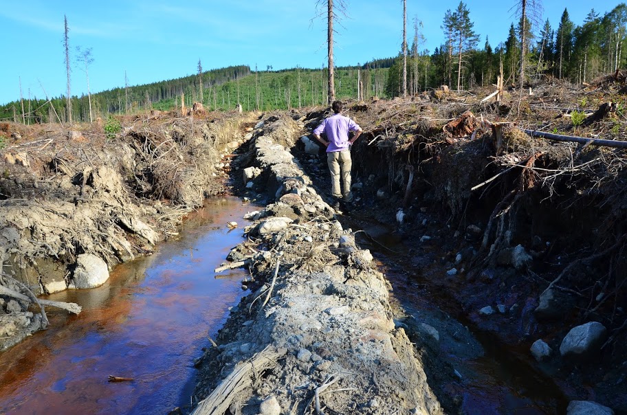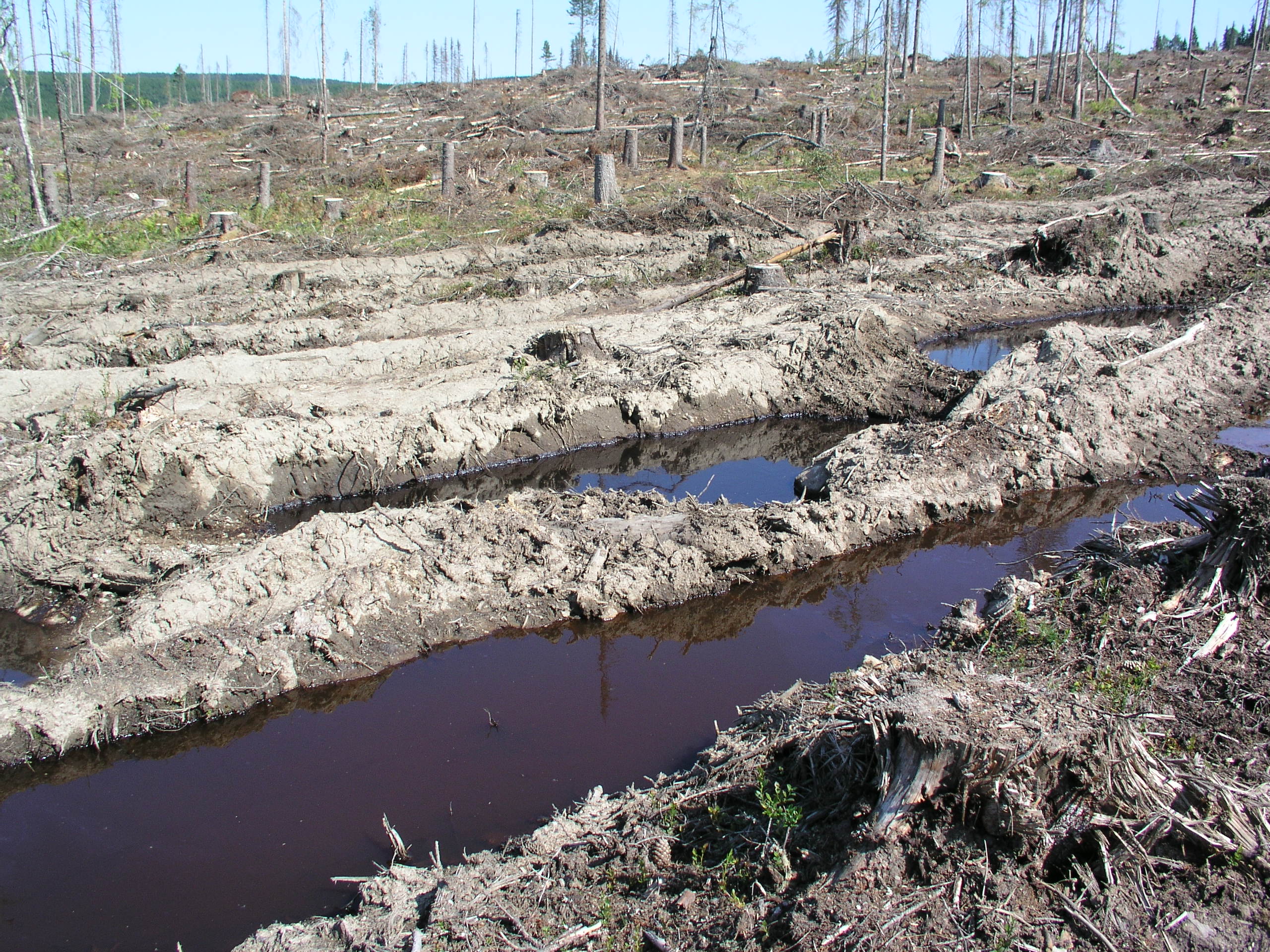 Även om markberedningen enligt lag ska vara skonsammare idag är tidigare så lämnar maskinerna ofta stora sår efter sig. Sår som skapar ränder av vattenfyllda diken som ibland blir över 1 meter djupa. Mellan dessa fåror ska det då växa ett bestämt antal plantor. För lågt antal renderar böter och stödplantering. Dessa fåror dränerar marken på mineraler och frigör även tungmetaller som ofta rinner med regnvattnet ner i närmaste vattendrag. Slam och tungmetaller är direkt skadligt för de vattenlevande djuren i bäckar och vattendrag, och förslamningen orsakar dessutom att romen från laxfiskarna kvävs i sedimenten.. Här kommer vattendirektivet in och skapar klara regler för markanvändning i anslutning till vattendrag, men det saknas ambitioner att efterleva dessa regler. Alltför ofta ser man hur det avverkas liite mer än vad som är reglerat.