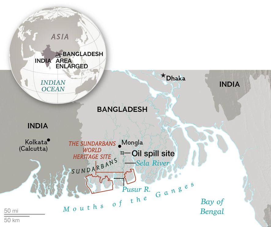 Vad har då inträffat!! – jo följande har skett. För två år sedan kolliderade två fartyg.Ett av fartygen sjönk,en oljetanker med 350 000 liter olja ombord. Direkt efter olyckan gjordes några tafatta försök att bärga fartyget, men det lyckades inte. Sedan dess har alla bara väntat på det som nu skedde den 9:e december, då ett fartyg körde in i den förlista oljetankern. Då påbörjades en bärgningsinsats, men det visade sig att all olja runnit ut då tankern sprungit läck i samband med den andra kollisionen. Området är ett av tre speciellt skyddsvärda områden inom Sunderbans – detta för att forskning visat att den sällsynta Irrawaddydelfiner finns där.Dessa farvatten öppnades av myndigheterna för bara några år sedan. Orsaken är att det planeras för två kolkraftsverk i kanten av Nationalparken. De planerade kolkraftsverken har mött kraftigt lokalt motstånd, och Unesco har varnat Bangladesh att Sunderbans kan förlora sin status som världsarv om dessa kolkraftverk blir av.