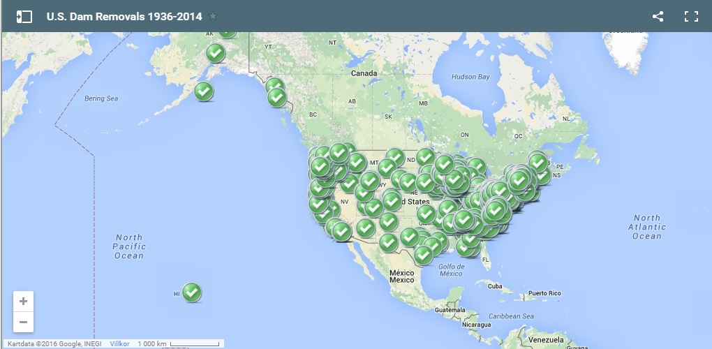 Alla dessa prickar visar på ett vandringshinder av något slag.Googlar du – dam removal USA och väljer bilder – så kommer det upp bilder som den nedan. Googlar du på motsvarande ord för Sverige så finns inga såna bilder att tillgå – det säger väl en del.