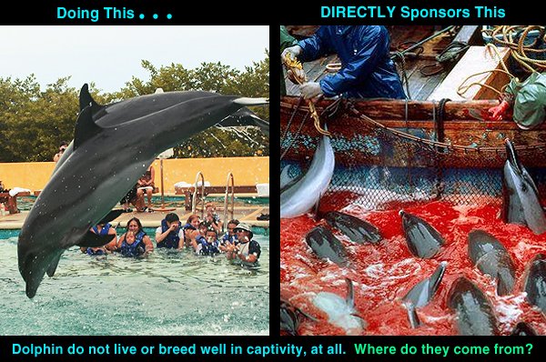 Kom i håg, det är samma eländiga levnadsförhållanden vare sig det är en anläggning för enbart uppvisningen eller ställen där du ges möjlighet att simma med delfiner i stora inhägnader. Dessa djur är skapta att simma med sin stora familjegrupp mil efter mil, dygnet runt, året runt, livet ut.