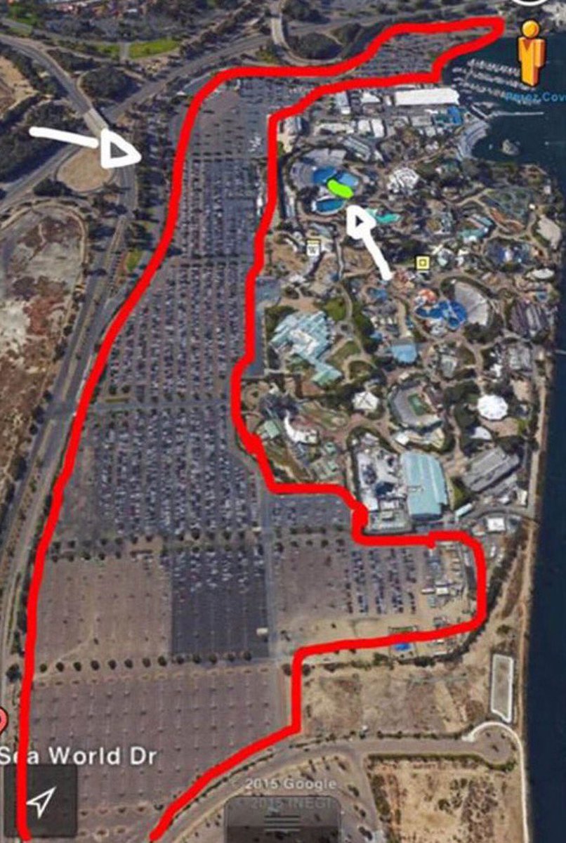 Den som är inringat med rött är parkeringsplatser, och den lilla gröna fläck du ser – det är den bassäng där Sea world anser att deras Späckhuggare lever ett bra liv.