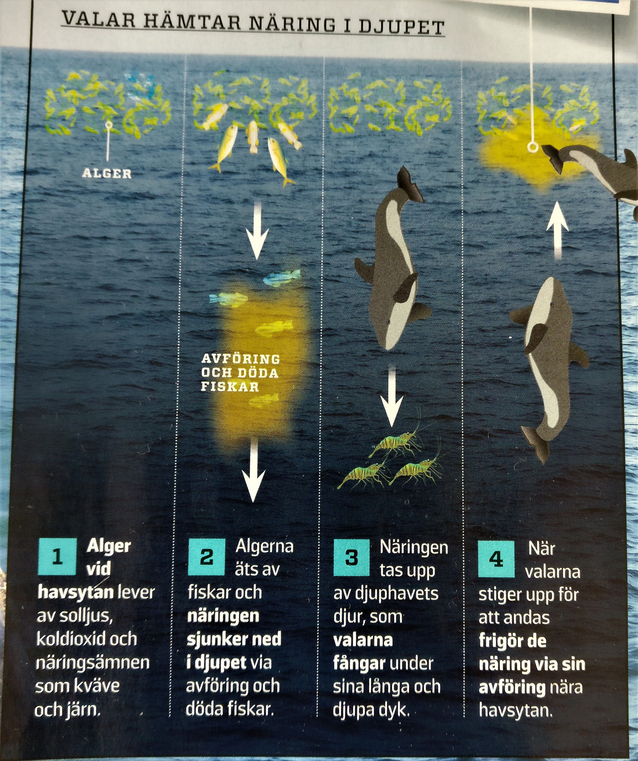 Värt att tänka på – mina beräkningar gäller endast blåvalen, men kom i håg att det under samma tid försvunnit miljontals med andra valar från våra hav och även deras bajs har ju samma betydelse – för att inte tala om det enorma utfisket – man behöver ju bara tänka att 150 ton torsk släpper ut lika mycket bajs som en blåval.
