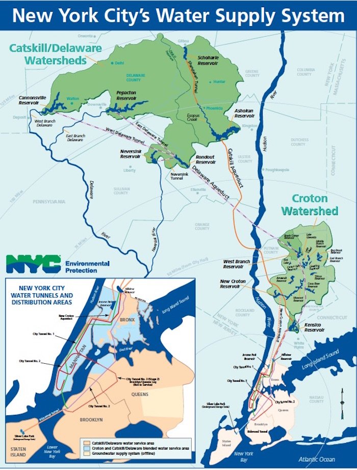 Googleöversatt från New Yorks vattenmyndighets hemsida: Varje dag levereras mer än 1,1 miljarder liter färskt, rent vatten från stora upstate-reservoarer - cirka 200 km från staden - till nio miljoner kunders kranar i hela New York. Vattenområdena i de tre systemen täcker ett område på nästan 2000 kvadratkilometer, ungefär lika stort som delstaten Delaware. Reservoarerna kombinerade har en lagringskapacitet på 550 miljarder liter. Vattnet flödar till New York City genom akvedukter, och 97 procent når hem och företag genom gravitation ensam; endast 3 procent måste pumpas till sin slutdestination. Klor tillsätts i vattnet för att döda bakterier och fluorid tillsätts för att förhindra tandförfall. Croton-systemet Croton-systemet ligger i Westchester, Putnam och Dutchess Counties och har 12 reservoarer och tre kontrollerade sjöar. Den största, den nya Croton-reservoaren, rymmer 19 miljarder liter vatten. Systemet levererar normalt 10 procent av stadens dricksvatten, men kan leverera mer när det är tork i vattendragen längre upp i staten. Catskill-systemet Catskill-systemet innehåller två reservoarer och levererar upp till 40 procent av stadens dagliga behov. Catskill vattendrag ligger i delar av Greene, Ulster och Schoharie län, cirka 100 miles norr om New York City och 35 miles väster om Hudson River. Delaware-systemet Delaware-systemet, i delar av Delaware-, Ulster- och Sullivan-län sydväst om Catskill-vattendraget, innehåller fyra reservoarer som ger 50 procent av stadens dagliga vattenbehov. Den största är Pepacton, som kan rymma över 140 miljarder liter vatten - mer än hela Croton-systemets kapacitet.