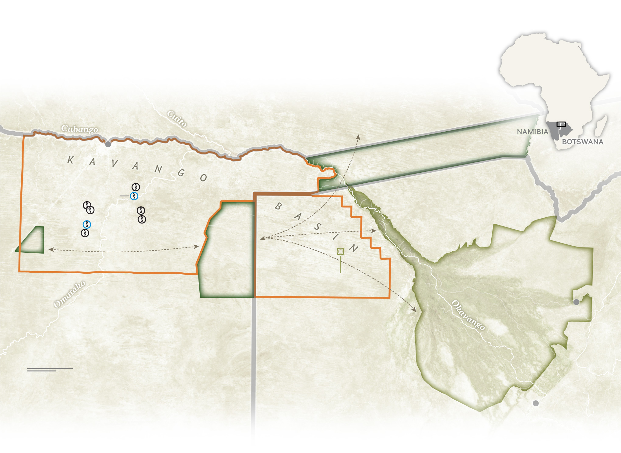 Världens mest berömda delta, inredning i otaliga naturfilmer där innevånarna tillhör en försvinnande liten del av det som en gång var hela kontinentens medborgare. Afrikas största grupper av fritt vandrande elefanter kan få sina vandringsvägar stoppade av hundratals oljeriggar.